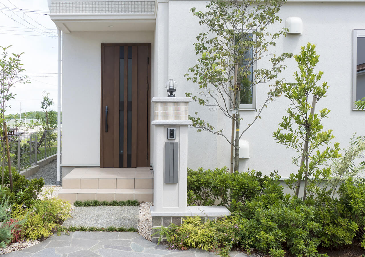【アプローチ・お庭】インターロッキングや砂利敷き、植栽などで、訪れる人を温かく迎える空間を作ります。